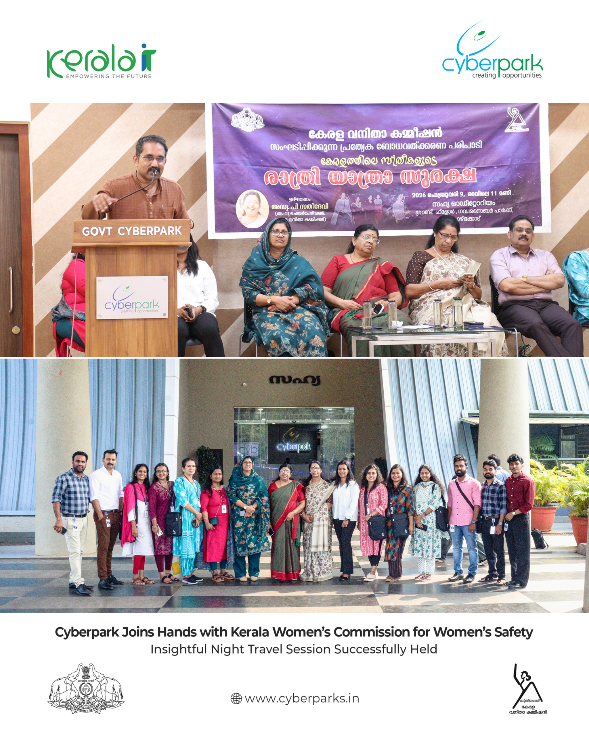 Cyberpark, in association with the Kerala Women’s Commission, successfully organized an impactful awareness session on “Safety of Women During Night Travel and Workplace Security” at the Multipurpose Hall, Sahya Building. The initiative underscored the shared responsibility of building safer environments for women—both within workplaces and beyond daily commutes.